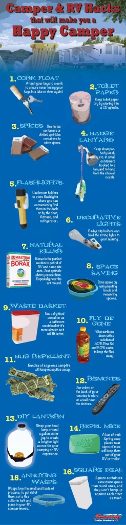 We’ve been seeing a big trend in social media this summer about camping hacks. There are so many things you can do to make camping easier and it’s been a lot of fun watching these suggestions come across our Facebook and Twitter feeds. We’ve made a list of our favorites, and put together an infographic specific for RV owners. Check them out, and then share with us some of your favorite camping hacks.